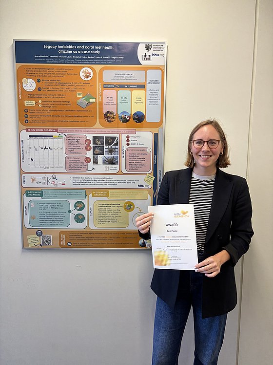 Vergangene Woche fand die NFDI4 Microbiota Annual Conference 2025 in Köln unter dem Motto “From Lab to Publication – Bridging the Gap with Best Practices” statt. Hier präsentierte Frau Marcellina Rola ihr Forschungsprojekt zum Thema "Herkömmliche Herbizide und die Gesundheit von Korallenriffen: Atrazin als Fallstudie" im Rahmen einer Postersession.