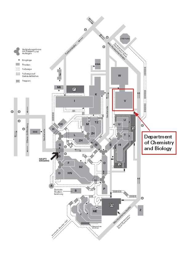 The University of Wuppertal with the Department of Chemistry & Biology is located in the district Wuppertal-Elberfeld (Gaußstraße) ca. 1 km south of the main railway station (Hauptbahnhof) or the "Schwebebahnstation Döppersberg".